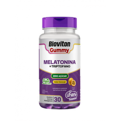 MELATONINA + TRIPTOFANO Unilife Vitamins é um suplemento em formato de pastilhas de gomas mastigáveis sabor maracujá. Livre de lactose e não contém glúten.