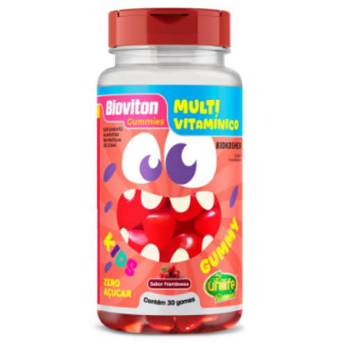 Bioviton Gummy Kids Multivitamínico Framboesa 30 Gomas da Unilife, formulado com vitaminas e minerais necessários ao crescimento e desenvolvimento saudável da criança. Auxilia no aumento da imunidade infantil.