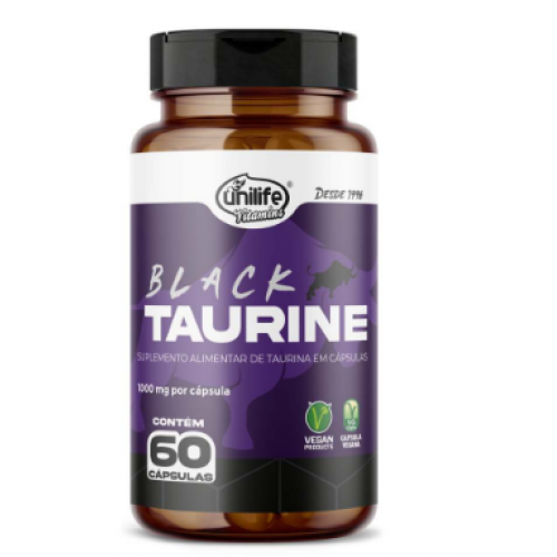 Black Taurine 60 Cápsulas da Unilife, auxilia na concentração de cálcio, nas contrações cardíacas e fortalecimento muscular.