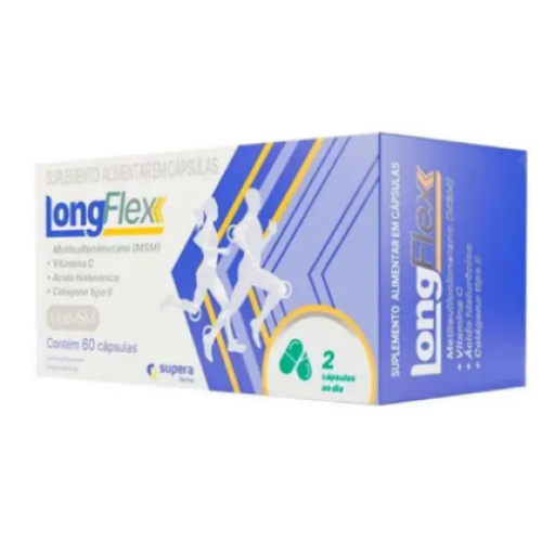 O LongFlex é um suplemento alimentar em cápsulas formulado com colágeno Tipo II, vitamina c, Ácido Hialurônico e MSM (metilsulfonilmetano). Indicado para uso adulto, sua embalagem contém 60 cápsulas.