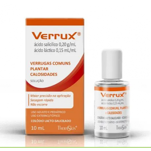 Verrux é um removedor de verrugas comuns, plantares e de calosidades. É composto de 0,20 g/ml de Ácido Salicílico e 0,15 g/mL de Ácido Láctico. Possui maior precisão na aplicação, com secagem rápida e que não deixa o produto escorrer. Solução tópica de uso externo em adultos e crianças a partir de 2 anos.